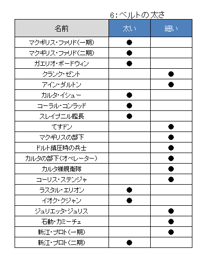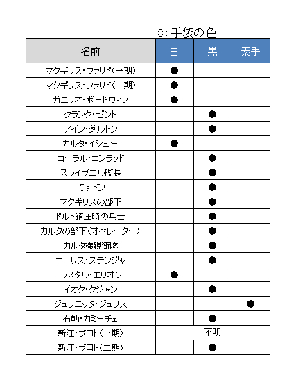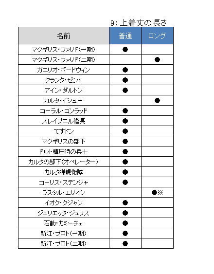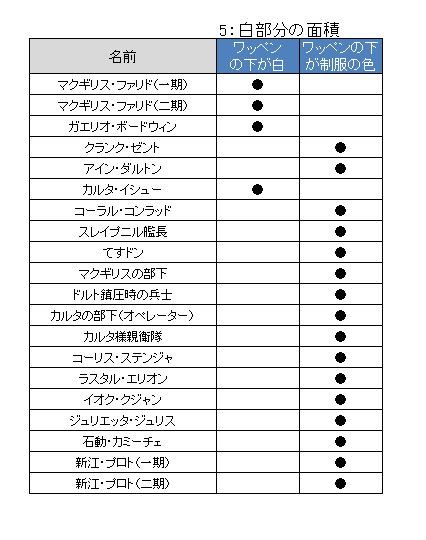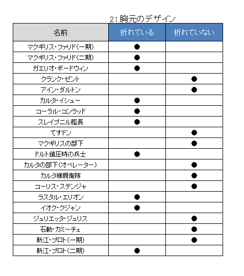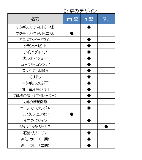また、尉官であるアインとクランクが縦線なしの肩当てをつけているところ、階級なしのジュリエッタがここでも肩当てなしであるところ、更にてすドン氏、マッキーの部下、カルタ様部下のオペレーターなども肩当てなしであるところなどから考えて以下の法則でこの部分はデザインされているのではないかと思われます。