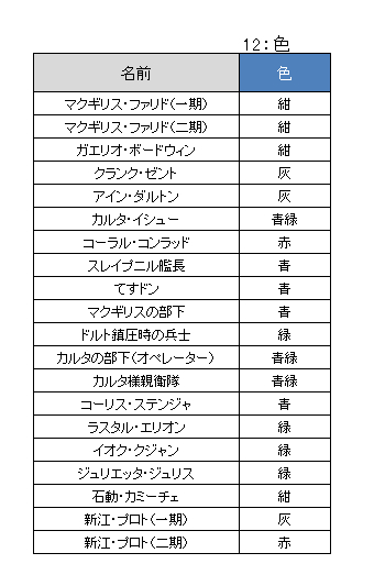 これらの12の差分について各キャラクターごとに比較し、差分と階級、役職などの因果関係を検証してみます。