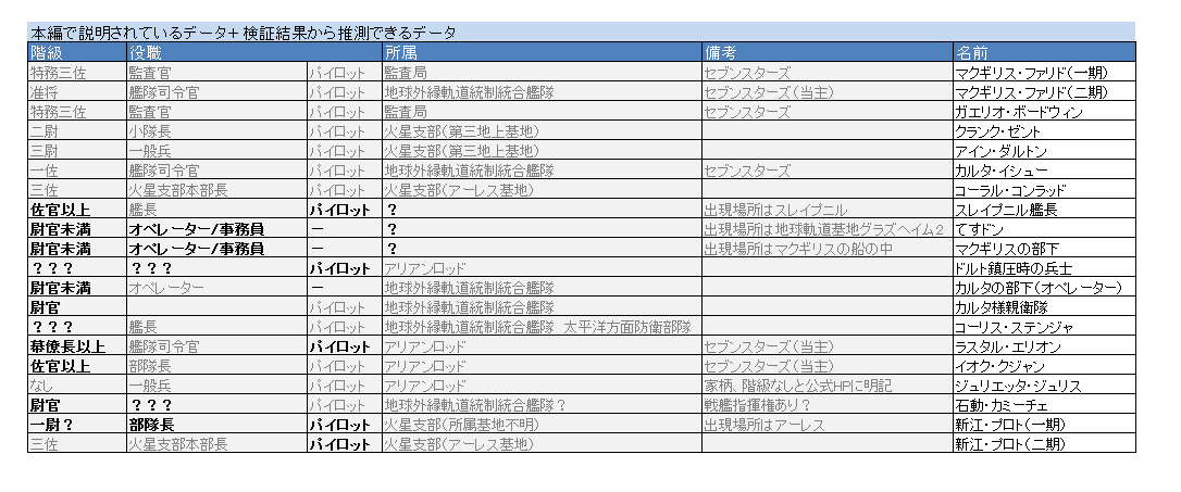 あの世界の戦闘方法や設立の経緯などを考えると、まあそういうもんなんでしょうが、戦艦とかあるならオペレーターなど「MSで戦闘するわけではないけど戦闘には絶対必要な人員」って必ず存在するものだと思うんですけどそういう人も最終的にはMSに乗って出世するってことなんでしょうか。あと医者とか整備士とかの階級もどうなってるか気になりますがこれは兵士とは別の階級があるのかもですね。知らんけど。