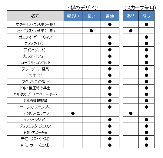 また、尉官であるアインとクランクが縦線なしの肩当てをつけているところ、階級なしのジュリエッタがここでも肩当てなしであるところ、更にてすドン氏、マッキーの部下、カルタ様部下のオペレーターなども肩当てなしであるところなどから考えて以下の法則でこの部分はデザインされているのではないかと思われます。