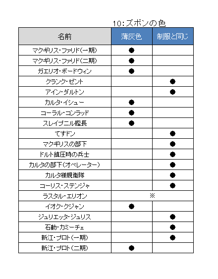 ラスタルは下半身何もはいてないので(語弊)サンプルになりませんが、これも分かりやすい差分だと思います。恐らく佐官以上で薄灰色になり、それ以下で制服と同色になるのでしょう。それは新江プロトのデータからも明らかです。一期の彼は制服色のズボンでしたが、二期の彼は灰色のズボンに変わっているのです。