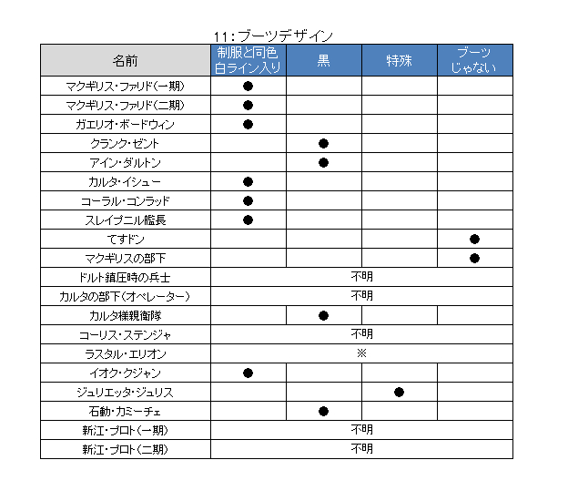 佐官以上であろうと推定される人々のブーツには白いラインが入っていて、尉官に相当すると思われる人々のブーツは黒です。ジュリエッタのみ白と黒の面積が反転したブーツを履いていますが、デザイン自体は尉官相当のブーツと同じものようです。